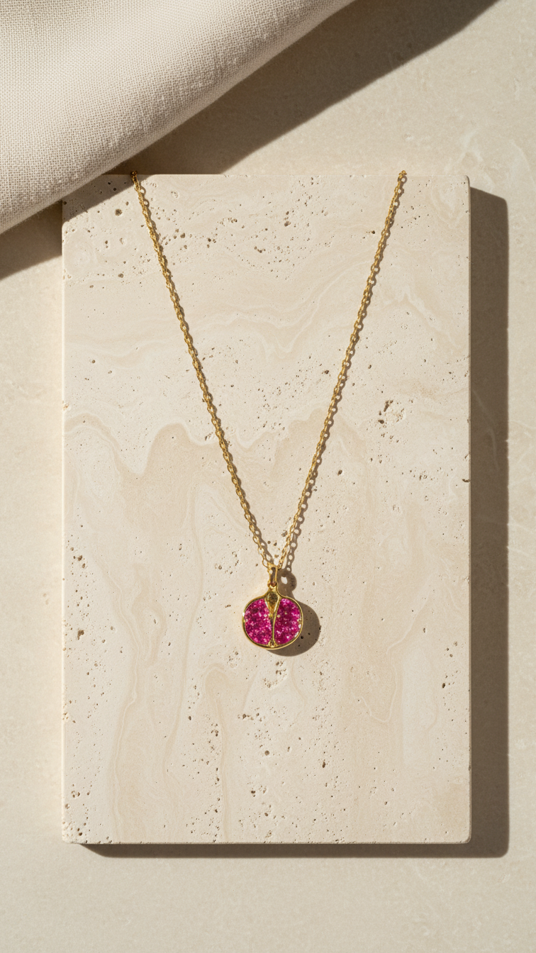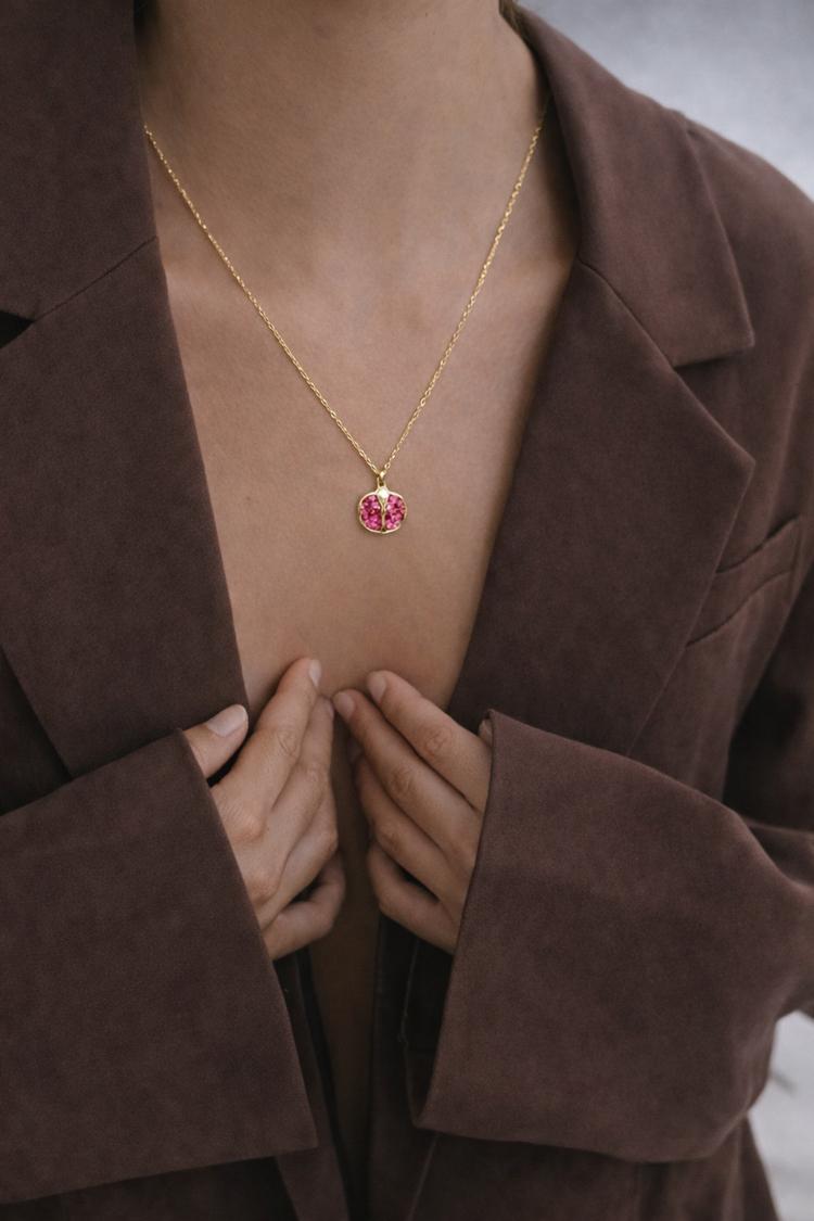 Nar, kültürümüzde bereketin, bolluğun ve şansın sembolüdür. Pembe taşlarla tasarlanan bu zarif nar kolye, hem anlamı hem de ışıltısıyla stilinize özel bir dokunuş katar.