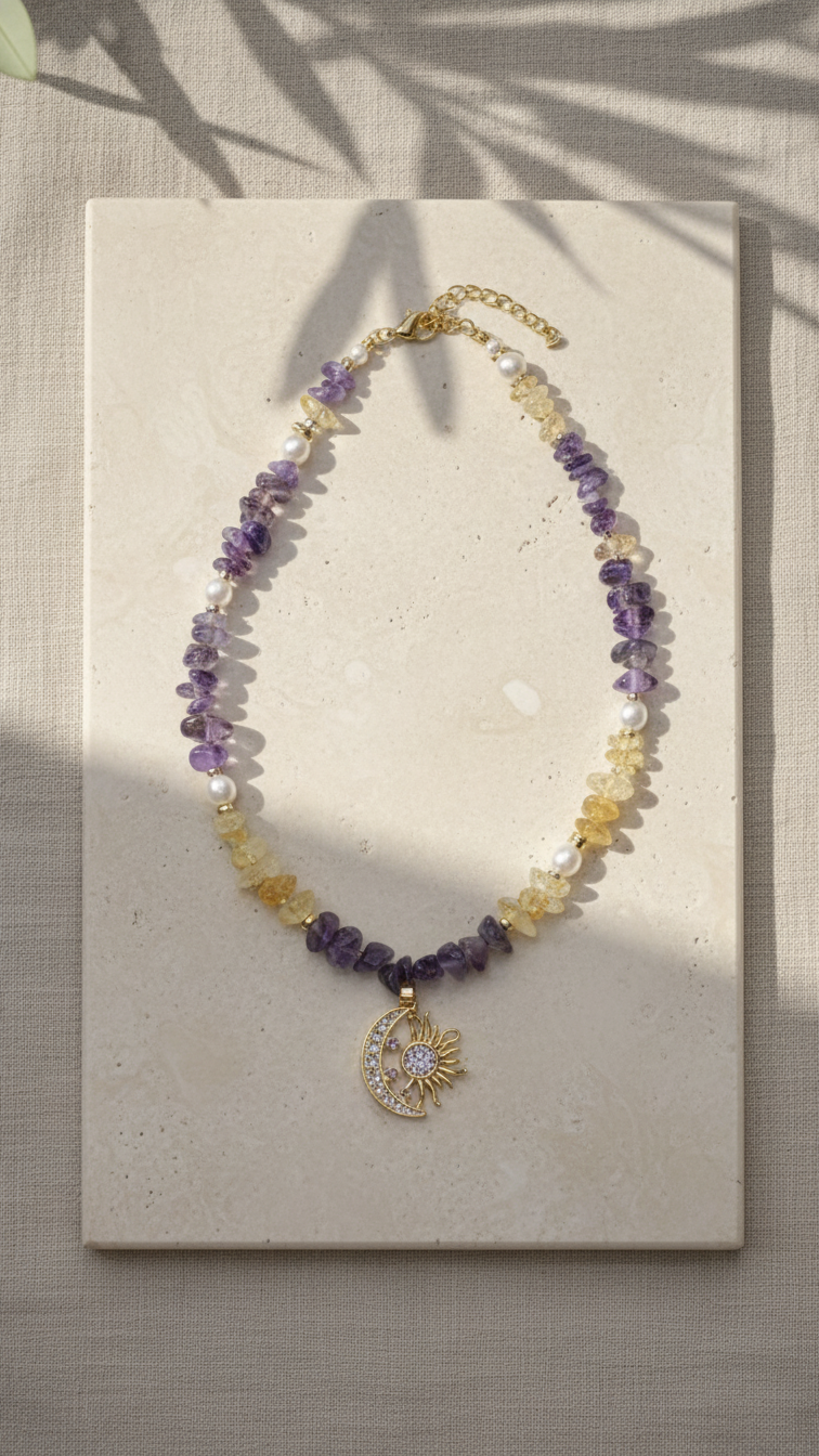 Doğal sitrin ve ametist taşlarının uyumuyla tasarlanan bu zarif kolye, güneş ve ay figürlü detayıyla güçlü ve anlamlı bir görünüm sunar. Mor tonlarıyla bilinen ametist taşı sakinlik ve dengeyi simgelerken, altın sarısı tonlarıyla sitrin taşı enerji ve pozitifliği temsil eder.